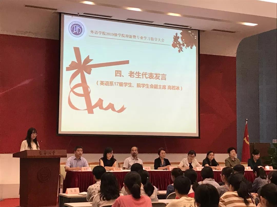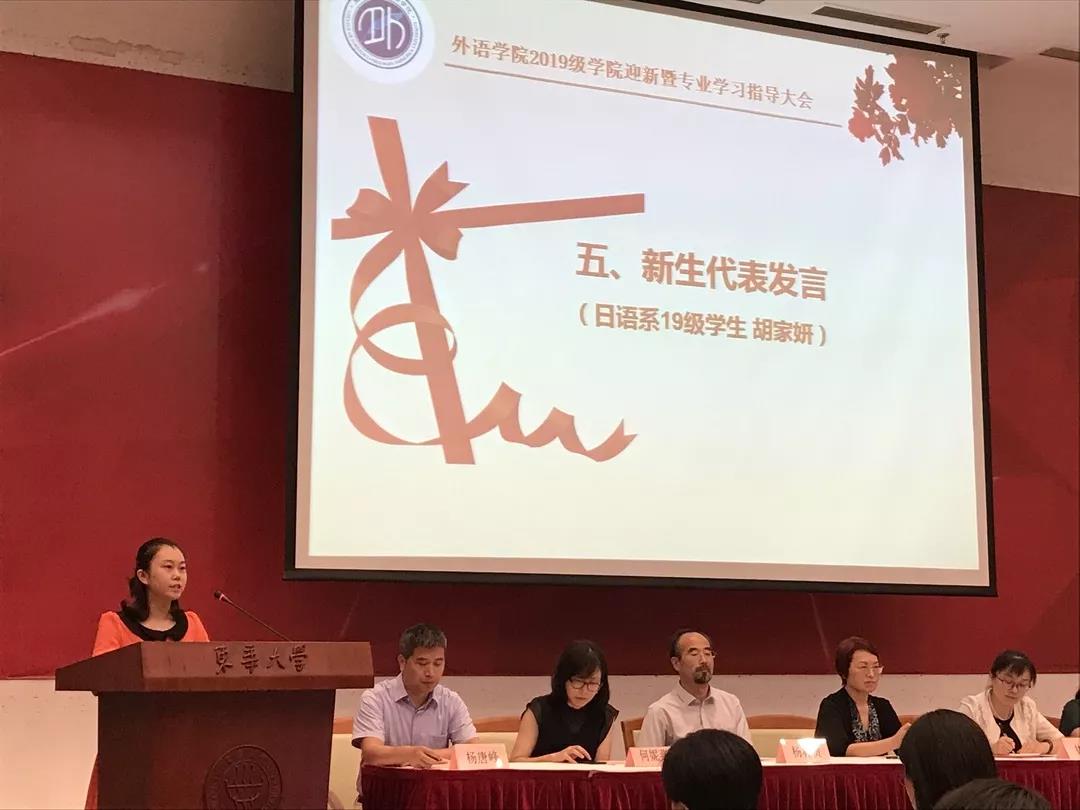 来自日语系19级的新生代表胡家妍同学也表达了对于大学生活的期望与憧憬,并用《本杰明巴顿奇事》中的一段话与大家共勉,希望在大学四年的学习生活中与同学们建立深厚的友谊,多做对人生有意义的事,真正践行“崇德博学,砺志尚实”的校训。