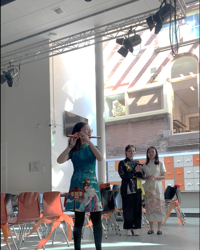 模拟联合国协会成员代表唐嘉玲在地球村活动中进行竹笛演奏