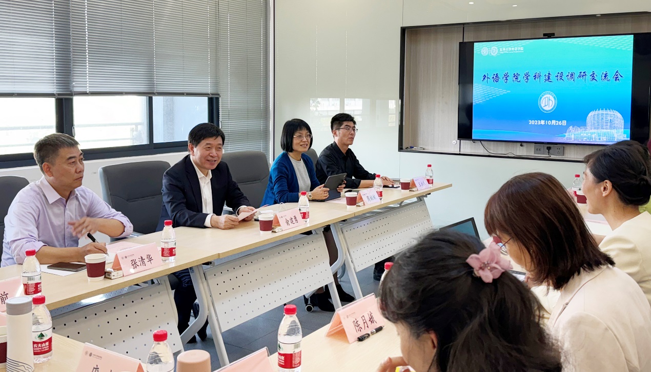 俞建勇仔细听取了学院在学科建设、队伍建设、学院发展等方面所作的工作以及遇到的瓶颈,对学院近年来在学科建设以及在全面提升全校公共外语教学质量上付出的努力和取得的成绩表示肯定,对于学院进一步发展提出希望:一是要结合学院办学定位进一步优化学科布局,面向发展、突出特色、融入主流,在保证高水平教学质量的同时实现高水平学术产出;二是要突出抓好队伍建设这个重中之重,统筹教师队伍存量和增量,系统做好人才工作,为教师成长成才提供优质发展环境;三是要进一步深化教育教学改革,加强跨学科、跨学院之间的交叉融合,着力培养更多专业基础扎实的拔尖创新语言人才,更好服务经济社会发展。