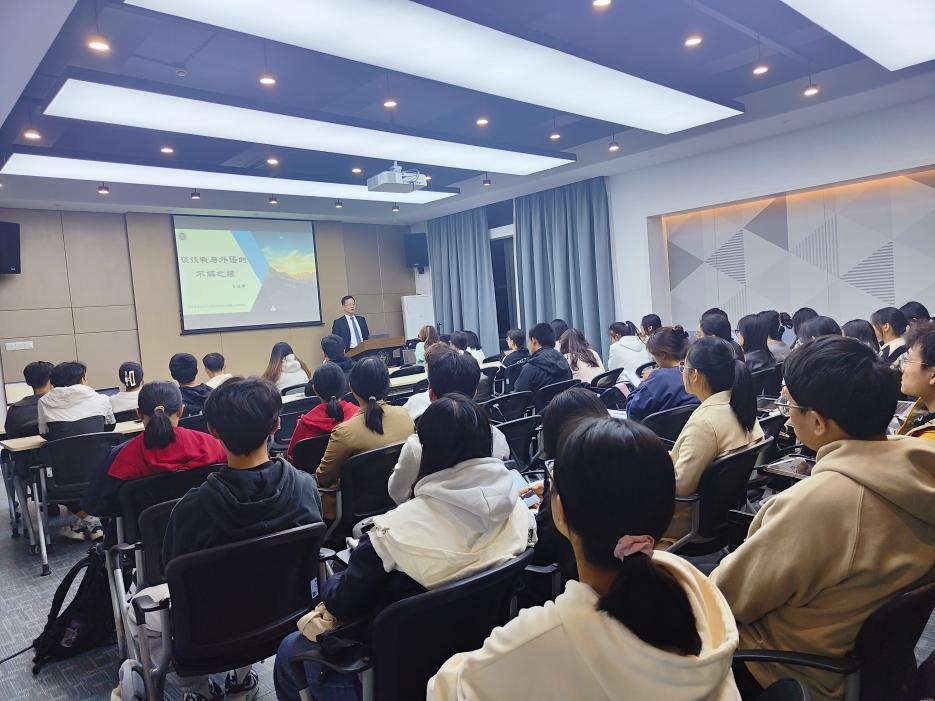 王健卿先生分享了个人求学和工作经历,并结合工作中的翻译实例,针对同学们感兴趣的话题,介绍了听读练习方法、外事翻译技巧等经验,对大学生提出了三点期待:一是勇于走出舒适圈,到更大的舞台上去磨砺锻炼自身;二是坚定目标,找准选择,把有限的时间和精力集中起来,朝着这个目标坚持不懈;三是结合自身,努力培养自己的个性和特色,塑造人格。