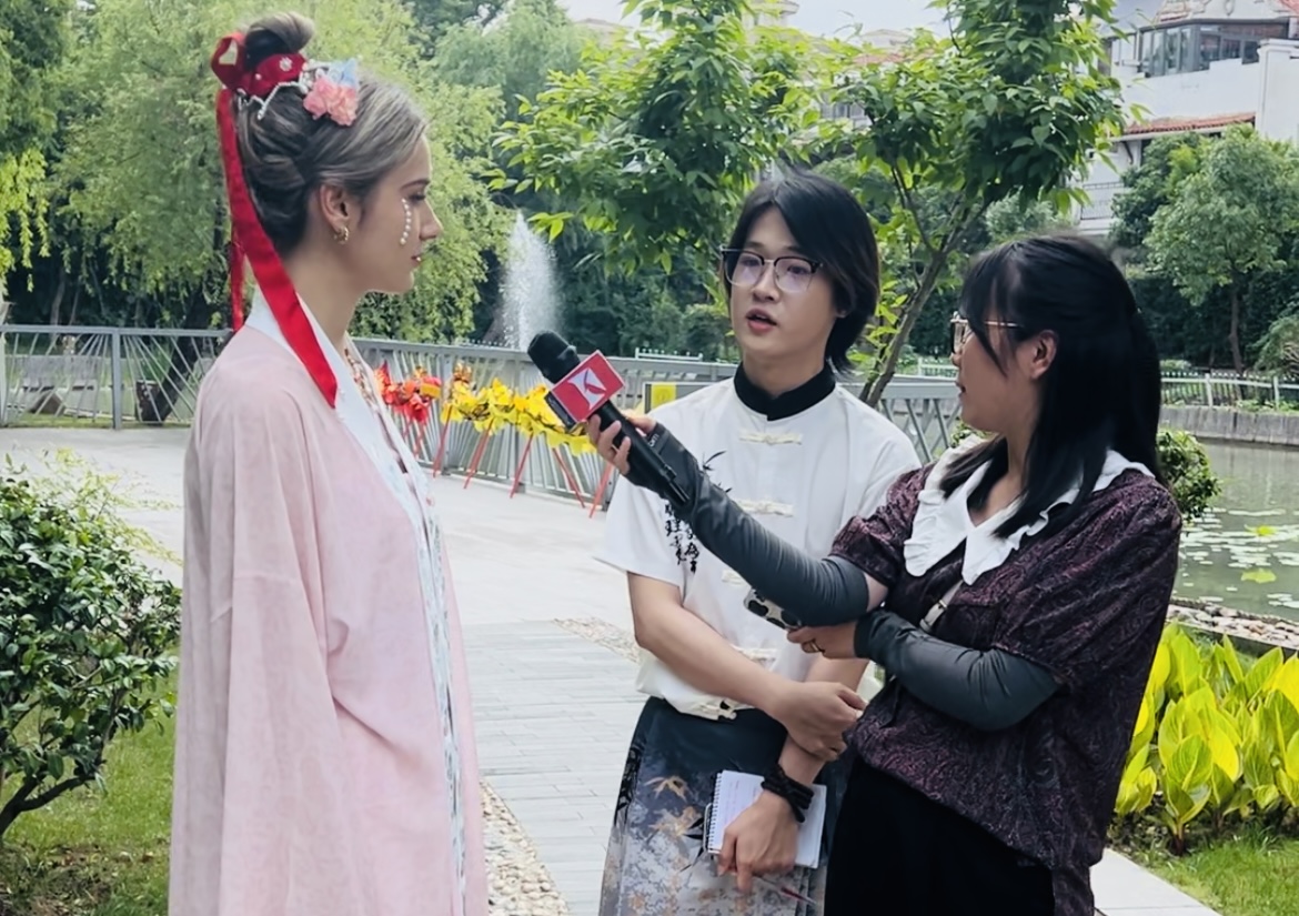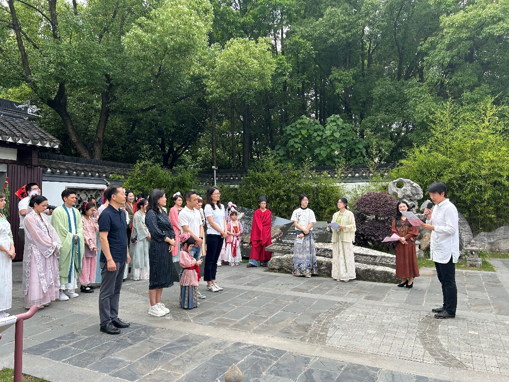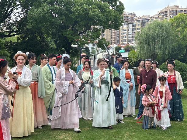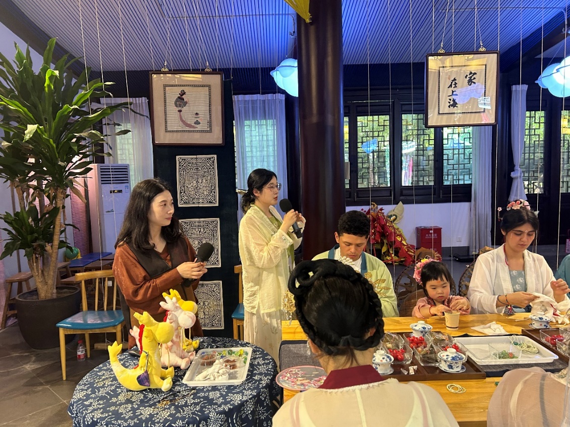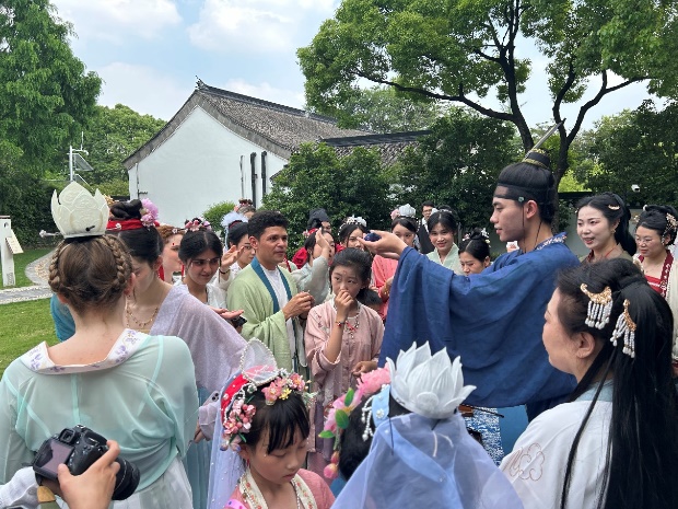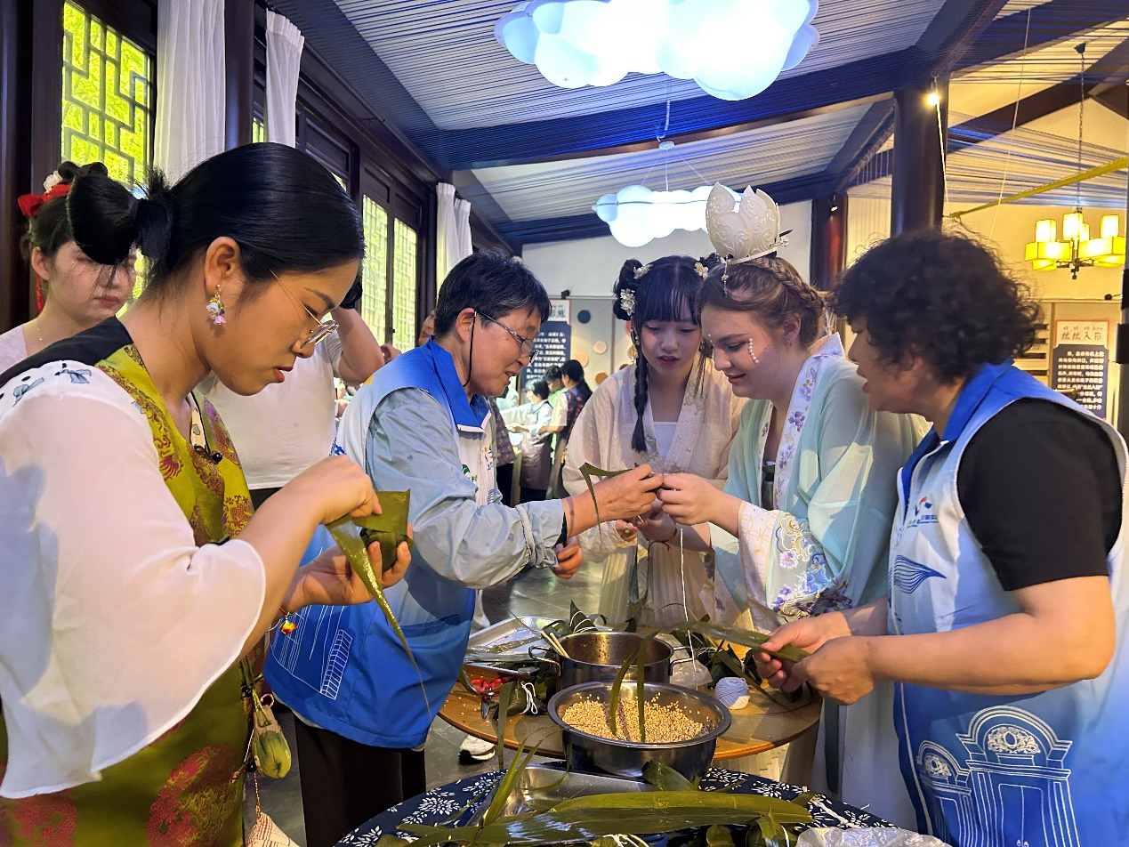 6月8日端午假期首日,威廉希尔体育网来自俄罗斯、土耳其、哈萨克斯坦等8国的留学生身着宋制汉服,于徐汇区黄道婆纪念公园沉浸式游园,共同体验了端午民俗活动和传统非遗活动,威廉希尔体育网英语系志愿者全程为外国友人口译,积极参与了中国传统文化的国际传播实践。